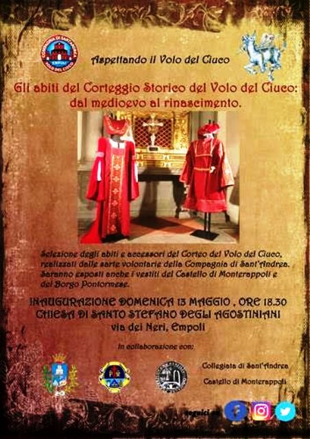 Sarà inaugurata domani, domenica 13 maggio, la mostra "Gli abiti del Corteggio Storico del Volo del Ciuco: dal medioevo al rinascimento". Appuntamento alle 18.30 presso la chiesa di Santo Stefano degli Agostiniani in via dei Neri a Empoli.