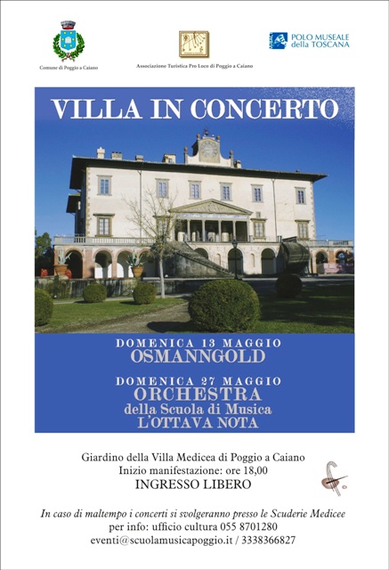 Con l’esibizione dell’ensemble OsmannGold si inaugura, domenica 13 maggio, la rassegna “Villa in Concerto”, organizzata dal Comune di Poggio a Caiano, alla scuola di musica L’Ottava Nota, alla Pro loco e al Polo museale della Toscana.