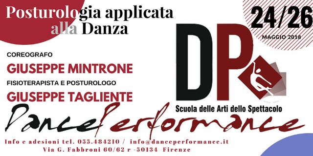 Dal 24 al 26 maggio a Firenze, organizzato dalla Dance Perfomance, si terrà lo stage, in esclusiva regionale, di Posturologia applicata alla danza e Espressione corporea, tenuto da Giuseppe Mintrone, coreografo e Giuseppe Tagliente, fisioterapista e posturologo Finalità dello stage è quella di impostare una giusta postura correggendo eventuali atteggiamenti posturali alterati o scorretti, migliorare tono e trofismo muscolare, equilibrio, coscienza e conoscenza del proprio corpo, sviluppare una maggiore armonia e coordinazione corporea e quindi, in generale, un miglioramento delle prestazioni del danzatore, riabilitare la traumatologia dei danzatori, sperimentare percorsi di sperimentazione gestuale e spunti per gestire in modo intelligente il movimento sia essa rivolto alla creatività o al miglioramento del funzionale. Di fatto saranno affrontate, oltre la danza, tutte le discipline che usano il corpo e il movimento come strumento per conoscersi, sentirsi e manifestarsi, consentendo lo sviluppo di capacità fisiche, emotive, creative, sociali, e contribuendo allo sviluppo integrale della persona.