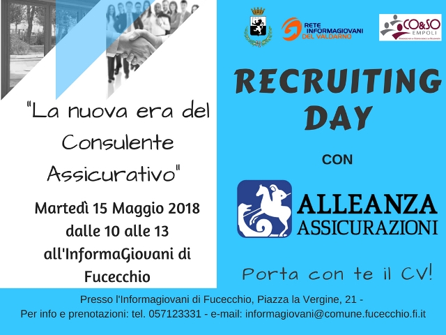 Domani Martedì 15 Maggio dalle 10.00 alle 13.00 lo Sportello Informagiovani del Comune di Fucecchio, sempre attento agli input provenienti dal mercato del lavoro, organizza un recruting day con ALLEANZA ASSICURAZIONI rivolto a diplomati di età compresa tra 25 e 40 anni "La nuova era del Consulente Assicurativo".
