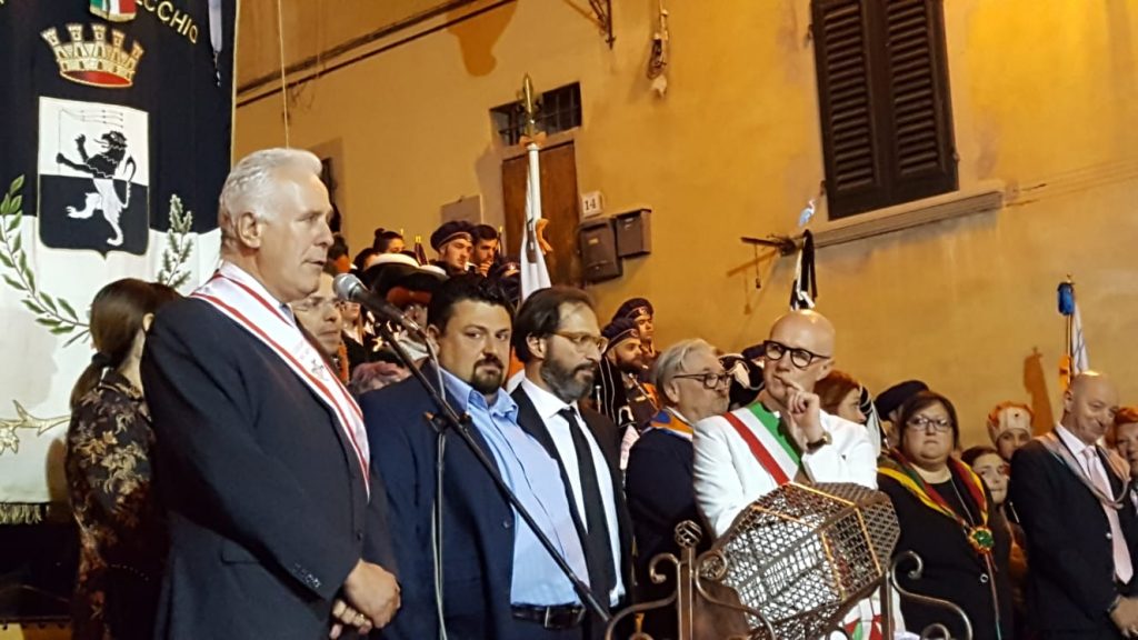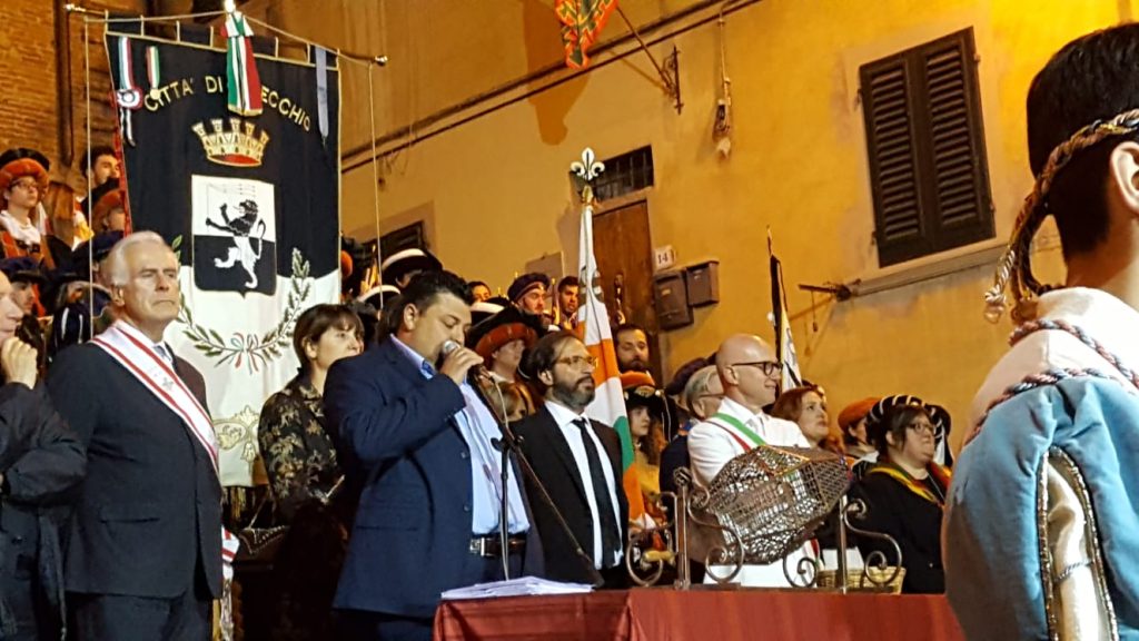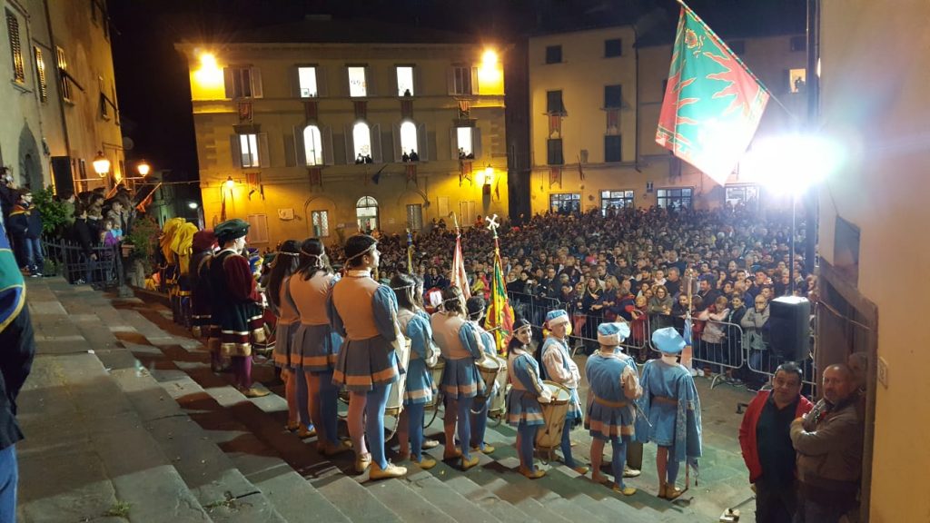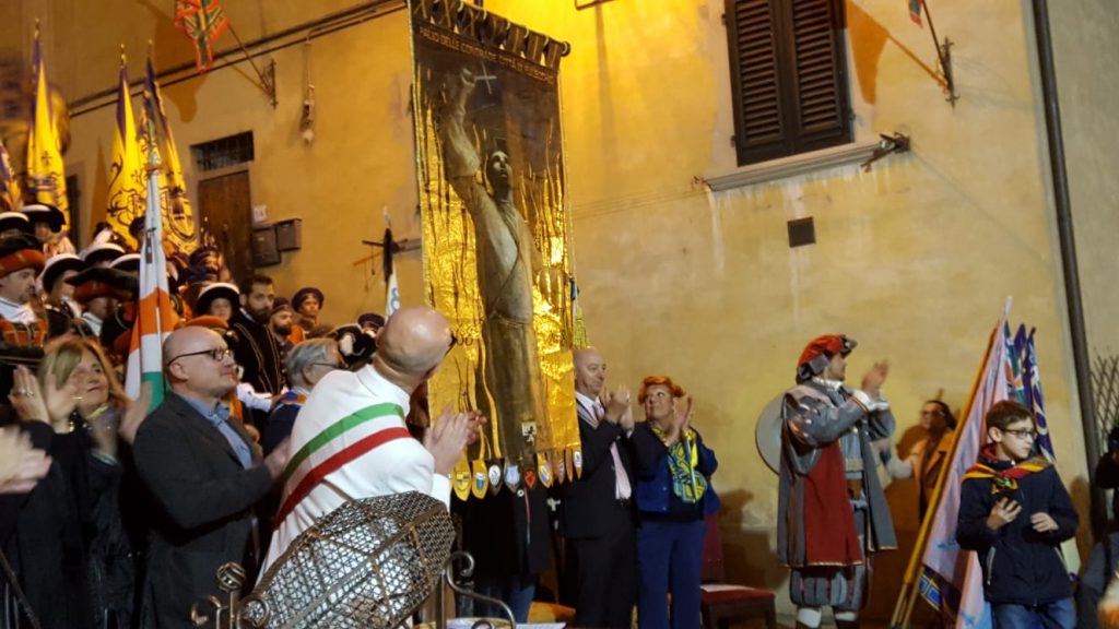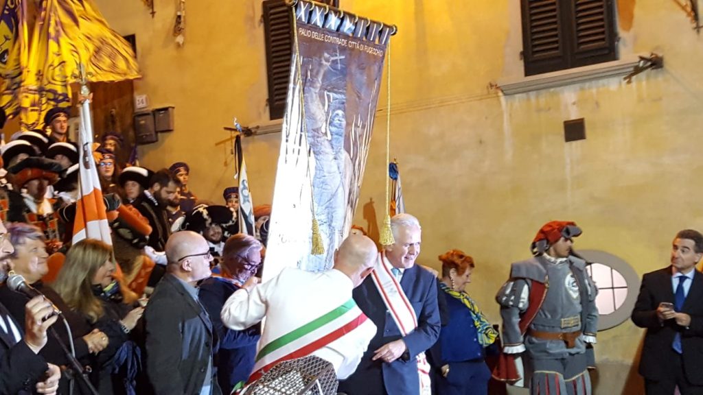 Alla presenza del presidente Nicolò Cannella, del sindaco Alessio Spinelli, del presidente del Consiglio regionale Eugenio Giani e del consigliere regionale Enrico Sostegni e di un nutrito pubblico di appassionati, le dodici contrade hanno sfilato con tanto di musica e sbandieratori. Gli studenti del 'Checchi' settore moda hanno portato il drappellone. Con la professoressa Grazia Focardi hanno disegnato alcuni degli abiti storici. Dettaglio non da poco: è stata una giovane di colore a sorreggere il simbolo dell'associazione.
