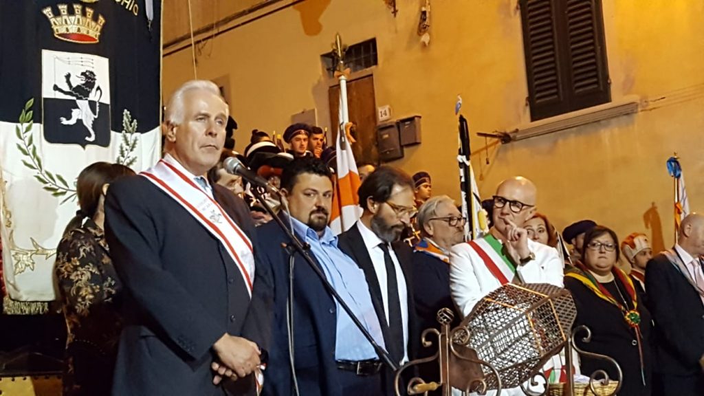 Nella splendida e gremita cornice di piazza Vittorio Veneto a Fucecchio è stato presentato il cencio del Palio delle contrade. In attesa della corsa di domenica 20 maggio, è stato svelato il drappo dipinto da Marco Neri, legato a San Pietro Igneo.