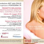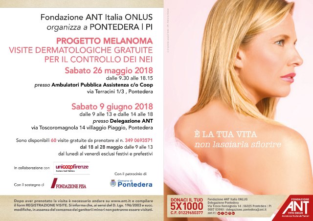 Anche quest’anno Fondazione ANT porta il Progetto Melanoma a Pontedera, aumentando il proprio impegno rispetto al 2017. Per il 2018 sono previste infatti tre giornate di visite dermatologiche gratuite a Pontedera e una a Pisa, per un totale di 120 controlli gratuiti.