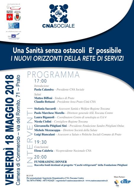 Questo primo evento farà il punto sullo stato dei servizi in tema di sanità, cura e assistenza su territorio con i massimi esponenti istituzionali di Regione Toscana, ASL Toscana Centro, Comune di Prato, Società della Salute e Fondazione “Pitigliani”, e sarà dedicato alla raccolta fondi destinati a due grandi operazioni: il Nuovo Polo Oncologico di Prato e il Progetto promosso dalla Fondazione Pitigliani sui “Caschi refrigeranti” (attraverso il fundrasing dinner che inizierà alle ore 20.00).