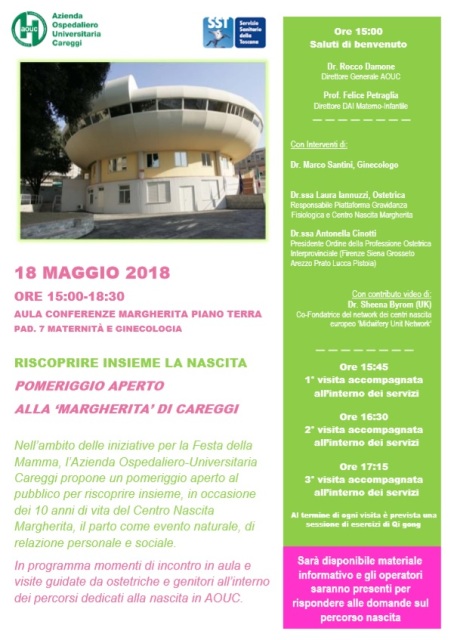 Venerdì 18 maggio dalle 15 alle 18:30 nell’Aula Margherita Padiglione 7 viale della Maternità Azienda ospedaliero – universitaria Careggi Firenze. In programma momenti di incontro e visite guidate all’interno dei percorsi dedicati alla nascita. Sarà disponibile materiale informativo e gli operatori saranno presenti per rispondere alle domande.