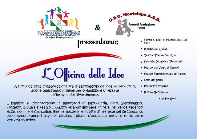 Torna dall'11 Giugno al 3 Agosto, L'Officina delle Idee. I centri estivi organizzati dalla Pubblica Assistenza di Montelupo (nel suo ramo della didattica, Pomerigginsieme) e dall'USC Montelupo A.S.D. Le iscrizioni sono già aperte.