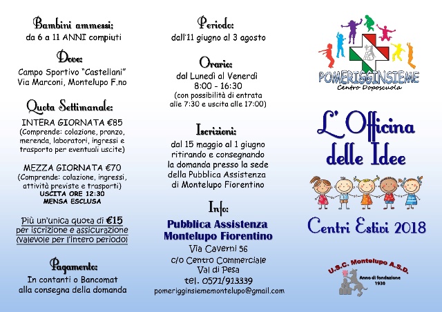 Torna dall'11 Giugno al 3 Agosto, L'Officina delle Idee. I centri estivi organizzati dalla Pubblica Assistenza di Montelupo (nel suo ramo della didattica, Pomerigginsieme) e dall'USC Montelupo A.S.D. Le iscrizioni sono già aperte.