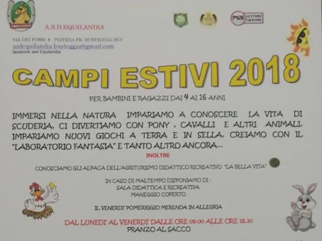L'Associazione Sportiva Dilettantistica Equilandia, con il patrocinio del Comune di Bagno a Ripoli, organizza i Campi Estivi 2018, per bambini dai 4 ai 16 anni.