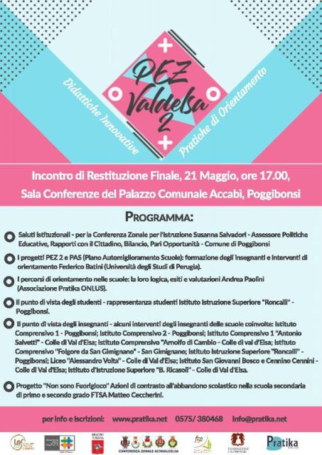Il seminario. I lavori inizieranno con i saluti istituzionali di Susanna Salvadori e proseguiranno con Federico Batini, dell’Università degli Studi di Perugia sui progetti Pez 2 e Pas destinati a formazione insegnanti e interventi di orientamento. Quindi interverrà Andrea Paolini dell’associazione Pratika onlus su “percorsi di orientamento nelle scuole: la loro logica, esiti e valutazioni”. Quindi saranno gli studenti dell’Istituto di Istruzione Superiore Roncalli a portare il loro punto di vista. A seguire le esperienze degli insegnanti delle scuole coinvolte che sono tutte quelle di Poggibonsi, Casole d’Elsa, Colle di Val d’Elsa, Radicondoli e San Gimignano. Infine Matteo Ceccherini per la Ftsa ,approfondirà il progetto “Non sono fuorigioco - azioni di contrasto all’abbandono scolastico nella scuola secondaria di primo e secondo grado”.