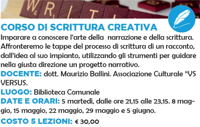 Articolato in cinque lezioni e arrivato al suo terzo incontro, il corso è pensato per chi voglia imparare a conoscere l’arte della narrazione e della scrittura. Curate dal Dott. Maurizio Ballini dell’Associazione “VS Versus”, le serate affronteranno le tappe del processo di scrittura di un racconto, dall’idea al suo impianto strutturale, utilizzando gli strumenti per guidare nella giusta direzione un progetto narrativo.