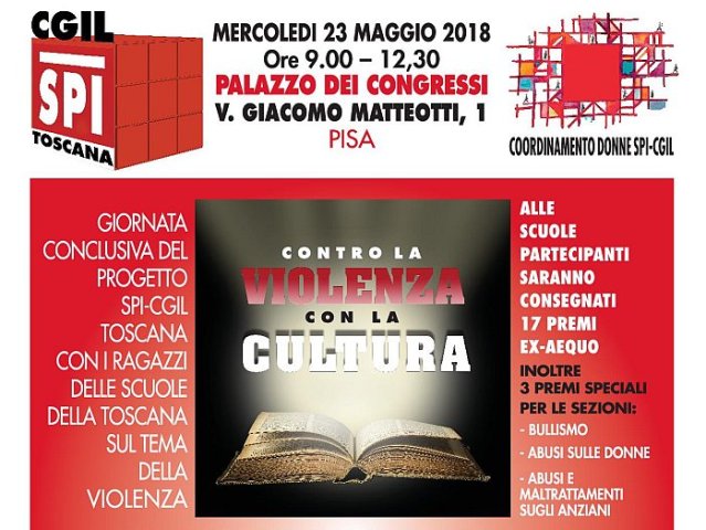Domani 23 maggio a partire dalle ore 9, al Palazzo dei Congressi di Pisa, saranno presentati i lavori del progetto “Educare al rispetto contro tutte le violenze” promosso da Spi Cgil e Coordinamento Donne dello Spi Cgil Toscana, che ha coinvolto circa 500 ragazzi delle scuole medie di I° e II° grado delle 10 province della regione. Un progetto che ha visto confrontarsi 21 istituti con il tema della violenza (o meglio: dei diversi tipi di violenza), tema che i ragazzi hanno declinato in diversi modi. Le classi partecipanti hanno scelto un percorso tra quelli proposti – il bullismo nelle sue diverse articolazioni (cyberbullismo, omofobia, razzismo), violenza contro le donne, abusi e maltrattamenti sugli anziani – e preparato un elaborato che sintetizzasse le loro riflessioni, declinato secondo diverse modalità (grafico, fotografico, multimediale eccetera).