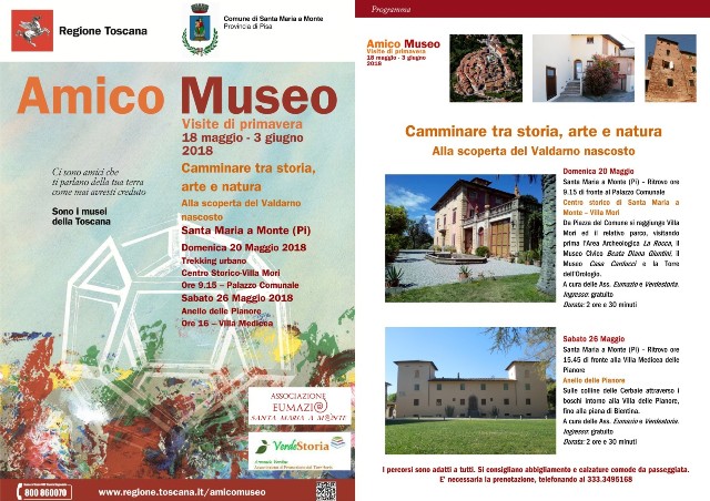 Dopo il primo appuntamento Domenica 20 Maggio con la camminata storico-naturalistica che ha toccato i musei del centro storico e il parco della vicina Villa Mori, Sabato 26 Maggio è in programma la seconda data di Amico Museo, la campagna di valorizzazione promossa dalla Regione Toscana alla quale il Comune di Santa Maria a Monte ha partecipato, assieme alla Rete Museale Valdarno di Sotto, con un articolato calendario di percorsi a carattere storico-naturalistico, in alcuni dei luoghi e paesaggi più significativi del Valdarno Inferiore.