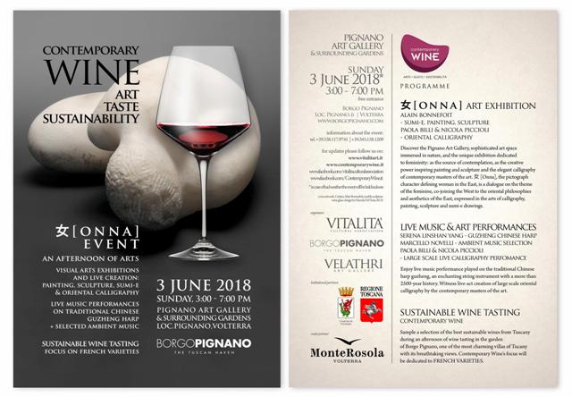 “Arte, Gusto e Sostenibilità” saranno celebrati grazie al binomio vino biologico toscano ed arte contemporanea. I vini saranno accompagnati dalle opere di artisti di fama internazionale che parteciperanno a questa edizione di Contemporary Wine a Volterra. Tema della mostra d’arte 女 – [Onna] è la femminilità, espressa nelle opere del pittore e scultore Alain Bonnefoit e dei maestri calligrafi Paola Billi e Nicola Piccioli, ospitate negli spazi della Pignano Art Gallery. Il giardino panoramico circostante sarà invece il palcoscenico della degustazione dei vini sostenibili, biologici e biodinamici locali selezionati, con un focus sui vini prodotti con vitigni francesi in purezza.