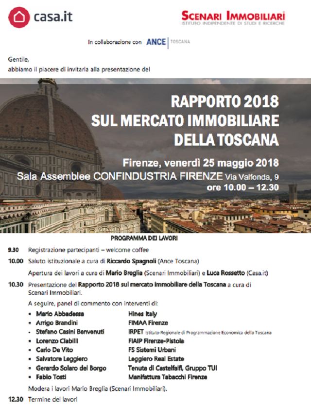 Dopo i saluti iniziali di Riccardo Spagnoli (Ance Toscana), il Rapporto sarà presentato da Mario Breglia (Scenari Immobiliari) e Luca Rossetto (Casa.it), e commentato da Mario Abbadessa (Hines Italy), Arrigo Brandini (FIMAA Firenze), Stefano Casini Benvenuti (IRPET Istituto Regionale di Programmazione Economica della Toscana), Lorenzo Ciabilli (FIAIP Firenze-Pistoia), Carlo De Vito (FS Sistemi Urbani), Salvatore Leggiero (Leggiero Real Estate), Gerardo Solaro del Borgo (Tenuta di Castelfalfi, Gruppo TUI), Fabio Tosti (Manifattura Tabacchi Firenze). A moderare i lavori sarà Mario Breglia (Scenari Immobiliari)