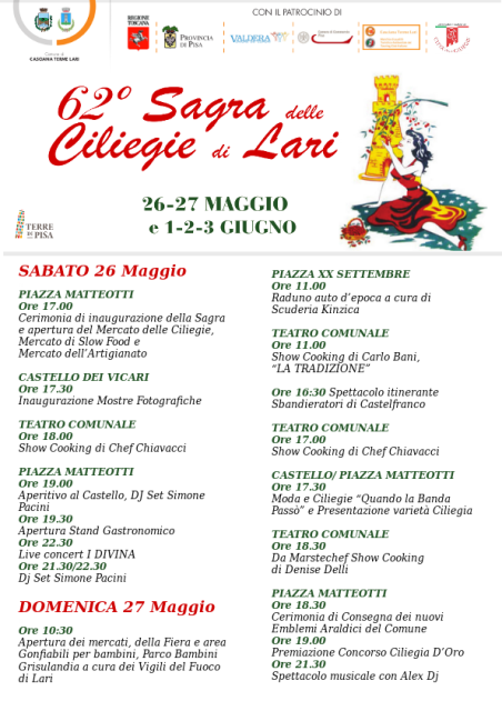 “L'edizione della Sagra di questo anno sarà ricordata per più motivi. – afferma il Sindaco Mirko Terreni – Il primo fra tutti è che non soltanto la Sagra ci sarà, ma sarà anche piena di eventi e incentrata a valorizzare i nostri migliori prodotti enogastronomici grazie ad un grande lavoro di squadra iniziato mesi fa e che adesso vede i suoi frutti. Il secondo motivo è che finalmente con il Comitato per la Tutela e la Valorizzazione della Ciliegia di Lari siamo arrivati a conclusione del percorso per il riconoscimento IGP della ciliegia di Lari, un percorso che l'Amministrazione Comunale ha fortemente sostenuto in questi anni anche con un importante contributo economico per consentire al Comitato di seguire tutto il complesso iter per arrivare ad ottenere il riconoscimento. In ultimo domenica 27 maggio, avremo alle 18.30 la Cerimonia di Consegna dei nuovi Emblemi Araldici del Comune. Un evento eccezionale nella storia del Comune che vedrà la partecipazione del Prefetto di Pisa la quale consegnerà gli Emblemi Araldici a tutta la nostra comunità, all'interno della splendida cornice della 62° Sagra delle Ciliegie.”