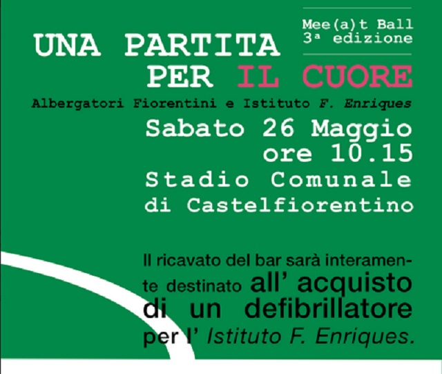 Sabato 26 maggio, allo stadio comunale di Castelfiorentino, si è svolta la III edizione di "Mee(a)t Ball", una partita di calcio tra la squadra Enriques, composta da Studenti e Professori e la squadra "Albergatori Amici per Firenze". Come per le edizioni precedenti, la finalità dell'evento era la raccolta di fondi per l'acquisto di un IV defibrillatore per la scuola, altri tre sono già stati comprati con denaro raccolto da altre manifestazioni svolte all'Enriques dall'inizio dell'anno scolastico. La prof.ssa Manzo e il prof. Principe hanno organizzato la mattinata, ma l'evento è stato fortemente voluto dall'Associazione Albergatori, che è sempre impegnato dal 2007 nella raccolta di fondi per fini benefici (https://
