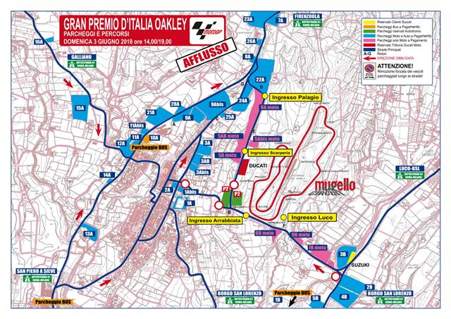 - il Prefetto della Provincia di Firenze ha disposto con propria ordinanza l'interdizione della circolazione dei veicoli aventi massa limite complessiva a pieno carico superiore a 3,5 t., nonché ai caravan ed autocaravan di qualsiasi massa in tutte le strade ed aree aperte al pubblico transito fino ad una distanza di km 5 dall'ingresso Paddock dell'Autodromo dalle ore 14:00 alle ore 21:00 di domenica 3 giugno 2018. I caravan ed autocaravan già presenti all'interno dell'Autodromo o dei parcheggi esterni potranno uscire dal perimetro dell'Autodromo o dall'interno dei rispettivi parcheggi privati solamente dopo le 21:00, salva diversa valutazione effettuata nell'immediatezza dalla Polizia Stradale;