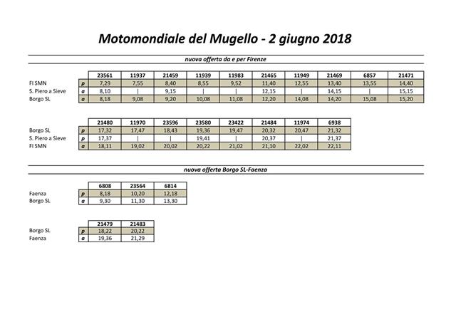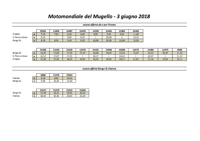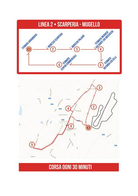 - nei giorni di venerdì 1 e sabato 2 giugno, a partire dalle ore 15.30 e fino alle 24.00, con una frequenza di 30 minuti. Le corse avranno inizio dalla rotonda in prossimità dell’ingresso del Mugello Circuit denominato ‘Arrabbiata’, proseguendo fino agli accessi ‘Scarperia’ e ‘Palagio’, e continuando verso Scarperia, toccando l’incrocio fra Viale Dante e Via Boccaccio, la rotonda ‘Coltelli’ e il Centro Commerciale. In prossimità delle fermate è posizionata adeguata segnalazione.