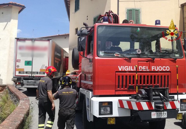 Un tir è rimasto incastrato tra le case di via Nerucci a Pistoia, nella zona dei cimiteri, vicino all'area industriale di Sant'Agostino. Sul posto sono dovuti intervenire i vigili del fuoco con un'autogrù per disincastrare il mezzo. Il camion si è trovato stretto tra le mura non riuscendo ad andare avanti e neppure a tornare indietro. L'intervento è durato due ore e la strada è rimasta chiusa al transito.