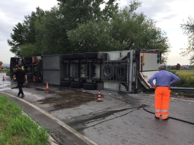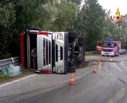 Un tir si è ribaltato sul fianco destro sulla via Romanina alla rotatoria di Capanne (Montopoli in Val d'Arno) questa mattina intorno alle 7 (non alle 8 come precedentemente riportato). Sul posto i carabinieri di San Miniato e i vigili del fuoco di Castelfranco di Sotto. Il carico del camion, generi alimentari, si è in parte riversato sulla strada. Opportuna bonifica è stata fatta anche sulla carreggiata per il gasolio fuoriuscito dal mezzo. Non ci sono stati danni a persone e il conducente è uscito illeso.