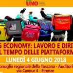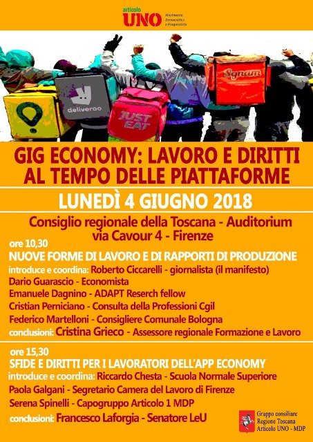 Appuntamento per lunedì 4 giugno, a Firenze, a partire dalle ore 10.30 presso l’Auditorium del Consiglio regionale, via Cavour 4, con il convegno organizzato dal gruppo di Articolo Uno Mdp in Consiglio regionale: “Gig Economy: lavoro e diritti al tempo delle piattaforme”.