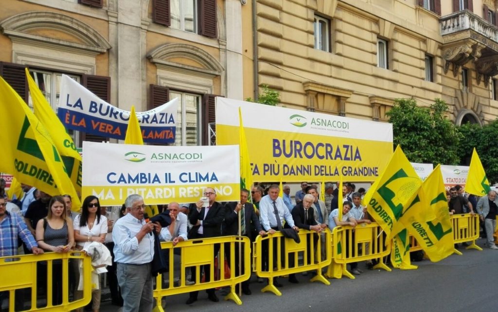 La manifestazione è stata organizzata da Asnacodi (Associazione dei Consorzi di Difesa) con il sostegno di Coldiretti che denuncia il rischio di perdere, per colpa della burocrazia, centinaia di milioni di risorse comunitarie destinate a fronteggiare gli ingenti danni provocati dai cambiamenti climatici.
