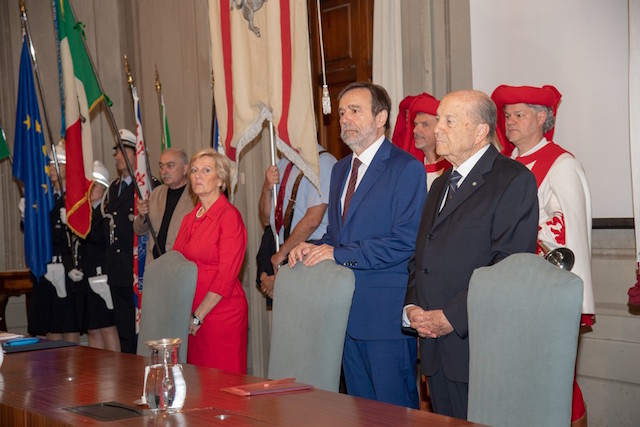 Nell’Aula Magna dell’Università di Firenze in piazza San Marco il rettore dell’Ateneo fiorentino, Luigi Dei, e il vice prefetto vicario reggente di Firenze,Tiziana Tombesi, hanno aperto i festeggiamenti con i loro saluti alle autorità e ai cittadini intervenuti alla cerimonia.