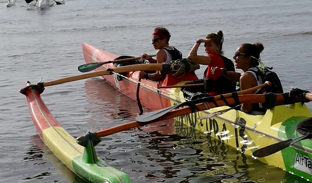 Tutto è cominciato alle sette del mattino con la preghiera al Dio Sole, come la tradizione polinesiana vuole, con l’augurio che “Tout se passe bien”, ovvero che tutto vada bene. Il mare è stato perfettamente calmo al primo mattino, a metà gara si è alzata un po’ d’onda condizionando le scelte per la rotta e la pagaiata.