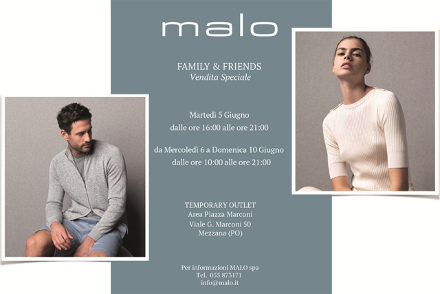 Si terrà da martedì 5 a domenica 10 giugno presso il temporary outlet del Centro Commerciale Marconi a Mezzana di Prato una vendita promozionale di capi di archivio e delle passate collezioni di MALO, l’azienda fiorentina ben nota per le sue produzioni di maglieria in cashmere ed abbigliamento di lusso che sta vivendo una fase difficile.
