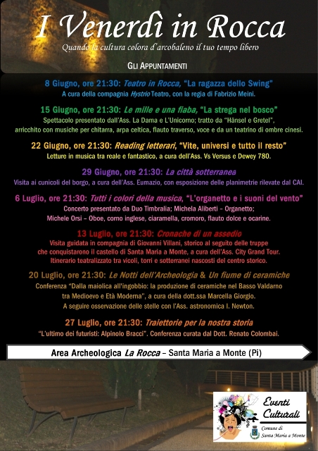 Con l’estate alle porte, Santa Maria a Monte propone il ciclo di iniziative serali denominate I Venerdì in Rocca, rivolto a far conoscere ancor di più il proprio centro storico, tramite eventi culturali finalizzati a colorare le serate estive.