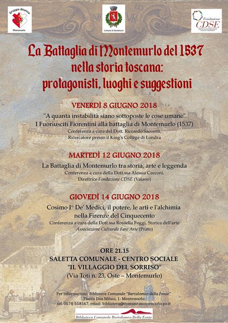Il ciclo si apre venerdì 8 giugno ore 21,15 con “A quanta instabilità siano sottoposte le cose umane. I fuoriusciti fiorentini alla battaglia di Montemurlo (1537)” a cura di Riccardo Saccenti, ricercatore al King's College di Londra. Martedì 12 giugno la direttrice della Fondazione Cdse, Alessia Cecconi parlerà de “La battaglia di Montemurlo tra storia, arte e leggenda”. Infine, giovedì 14 giugno alle ore 21,15 Rossella Foggi, dell'associazione “Fare Arte” di Prato, chiude la rassegna con “Cosimo I dei Medici, il potere, le arti, l'alchimia nella Firenze del Cinquecento”. Le serate sono a ingresso libero. Per avere maggiori informazioni si può contattare la biblioteca “Bartolomeo Della Fonte” telefono 0574-558567 o scrivere a biblioteca@comune.montemurlo.