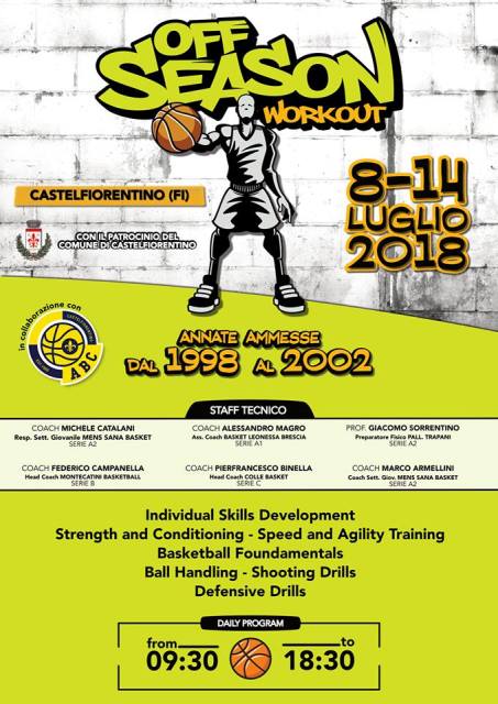 Con il patrocinio del Comune di Castelfiorentino e in collaborazione con l’Abc Castelfiorentino al via il primo Off Season BasketBall Camp aperto alle annate 1998-2002 e riservato ad un max di 50 ragazzi. Segnatevi la data: 8-14 luglio.