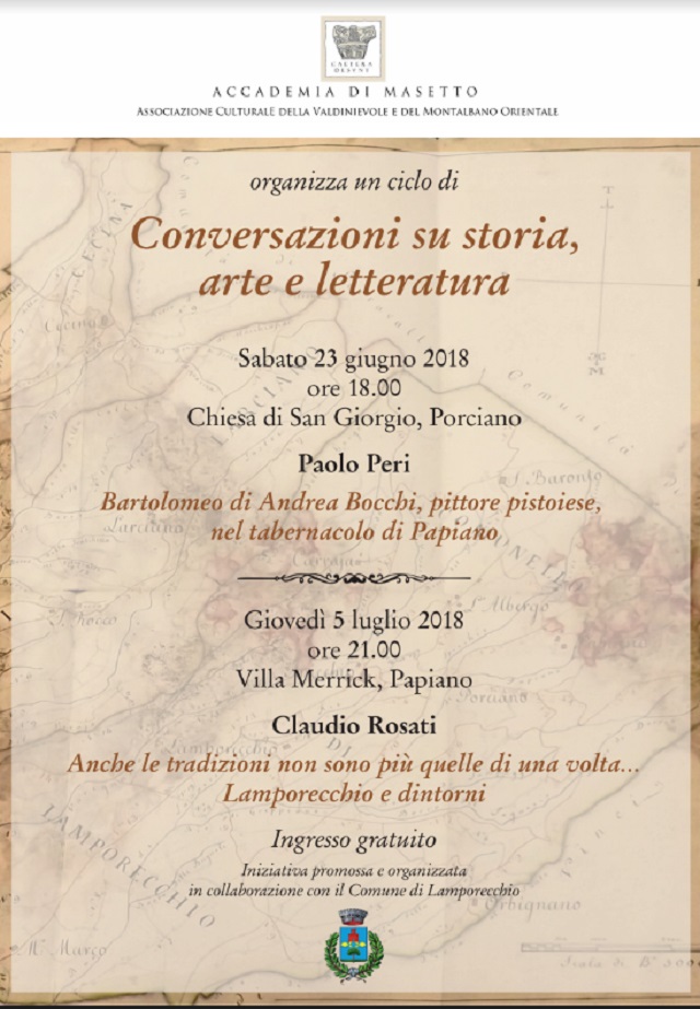 Nelle prossime settimane inizierà  il 3° ciclo di  Conversazioni sulla storia e cultura del nostro territorio.  Il primo appuntamento si terrà sabato 23 giugno, alle ore 18, presso la chiesa di San Giorgio, a Porciano. L’incontro ha come tema Bartolomeo di Andrea Bocchi, pittore pistoiese, nel tabernacolo di Papiano.