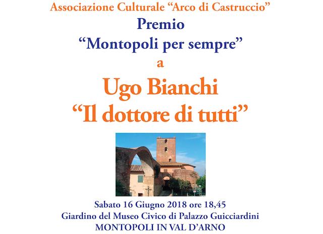 Si terrà a Montopoli la cerimonia di premiazione del dott. Ugo Bianchi . L'Associazione Culturale " Arco di Castruccio" gli ha infatti attribuito il premio. "Montopoli per sempre" per le doti di profonda umanità , grande competenza professionale, dedizione al Paese in cui è nato e vissuto. E' stato il Dottore per antonomasia, il medico di tutti; ha svolto la sua attivita' per più di 50 anni, coltivando contemporaneamente molti interessi, dalla pittura alla cultura locale, mantenendo vivo e costante l'amore per le cose belle.