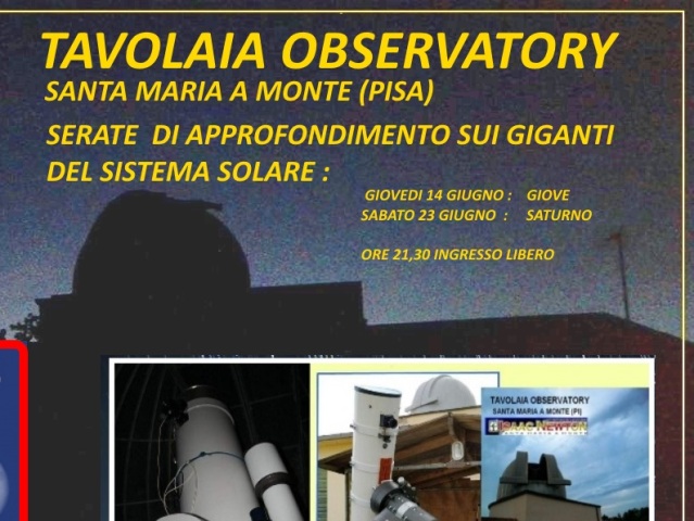 Tutti con il “naso all’insù” all’Osservatorio Astronomico di Tavolaia:  organizzate dall’Ass. Astronomica Isaac Newton, sono in programma due serate ad ingresso libero e gratuito dedicate all’osservazione dei pianeti.