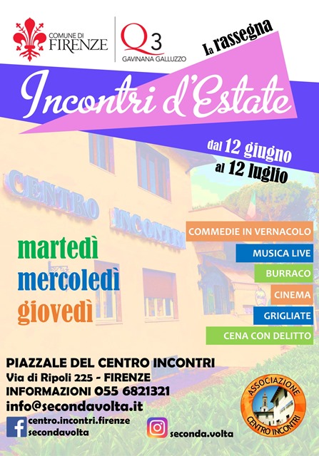 Parte questa sera, martedì 12 giugno, nel piazzale del Centro Incontri in via di Ripoli 225 la prima rassegna estiva “Incontri d'estate”, una serie di eventi che spaziano dalle commedie in vernacolo ai concerti live passando per un burraco sotto le stelle o una cena con delitto, il tutto accompagnato da serate gastronomiche.
