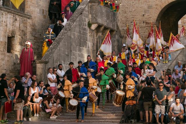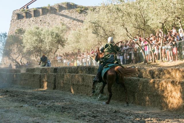 I popoli delle quattro Contrade della città, San Giovanni, Piazza, Castello e San Matteo compongono la scenografia della festa e si sfideranno con le gare di tiro alla fune tra gli uomini, la gara della treccia tra le fanciulle, il tiro con l’arco e la Giostra dei Bastoni.