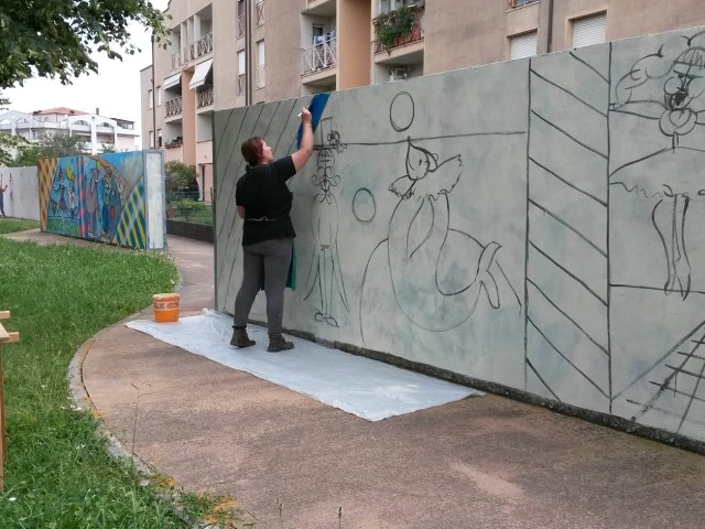 Di solito appannaggio di veri e propri artisti della bomboletta, stavolta i muri adiacenti il campino di via Santa Ubaldesca e il parco di via Caduti di Cefalonia e Corfù sono l’immensa tela su cui Sara Baldinotti e Marina Romiti stanno dipingendo opere coloratissime e divertenti che richiamano proprio l’atmosfera del gioco.