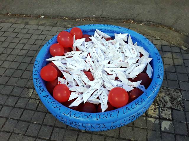 È stata lasciata in piazza della Costituzione una piccola piscina gonfiabile, di quelle che si usano per far sguazzare i bambini fino a qualche anno di vita, riempita di barchette di carta con nomi di persona. Il significato si comprende nelle scritte sul gonfiabile: "Voglio andare a casa la casa dov'è è dove posso stare in pace", citazione di Jovanotti, "Non si può vivere in un mondo chiuso", "L'indifferenza è l'ottavo vizio capitale". La rivendicazione è firmata con la sigla A.T.G., che i segnalatori, che sono rimasti volutamente anonimi, non hanno voluto spiegare. Nel messaggio inviato alla nostra redazione, si somma agli hashtag #restiamoumani #nofrontiere #antirazzismo una citazione del Vangelo di Matteo (25, 35-45), che parla proprio dell'accoglienza degli stranieri secondo le parole di Cristo: