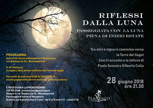 “Riflessi dalla Luna” è l’iniziativa promossa dall’associazione culturale Plantago insieme allo storico e guida ambientale, Paolo Gennai. Si tratta di una passeggiata al chiaro della prima luna d’estate, per le strade bianche che costeggiano i vigneti e gli oliveti, da Bottinaccio fino alla Torre dei Sogni.