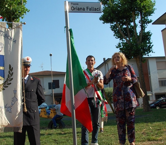 Oggi pomeriggio, lunedì 18 giugno, in via della Repubblica a Cascina, è stata intitolata la piazza ad Oriana Fallaci. A scoprire il cartello coperto dal tricolore sono stati Dario Rollo, vice sindaco di Cascina, e Donatella Legnaioli, onorevole e assessore a Cascina. Rollo ha letto l'intervento del sindaco Susanna Ceccardi, impossibilitata all'ultimo momento ad essere presente, mentre l'assessore Leganioli ha letto un passo del libro "Io e Oriana" di Magdi Cristiano Allam. "Oriana Fallaci meriterebbe molto di più di una piazza -si legge nell'intervento del sindaco- meriterebbe di essere studiata nelle scuole. Per quello che ha scrittoe per quello che la sua vita ci ha testimoniato". E ancora: "Lei, Oriana, ha visto arrivare una minaccia, terribile, capace di distruggere la bellezza e le diversità. Ha messo in gioco la sua credibilità per raccontarlo, a costo di essere emerginata ed esiliata dall'intellighentia nostrana. Non lasciamo noi oggi cadere la sua denuncia e dedichiamo questa piazza a una grande donna, una grande giornalista e una grande italiana".