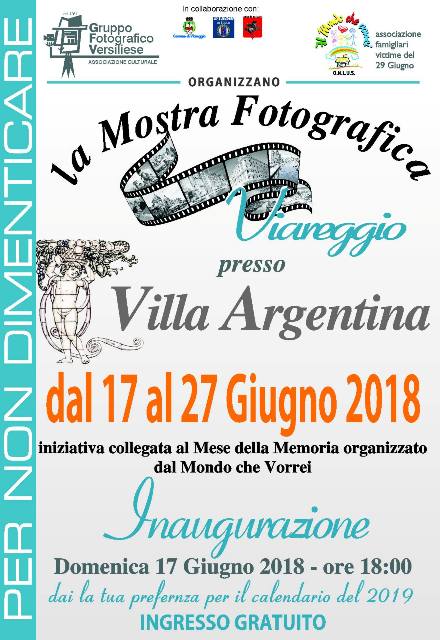 L’associazione culturale Gruppo Fotografico Versiliese in occasione della ricorrenza della strage ferroviaria del 29 Giugno ha organizzato presso Villa Argentina a Viareggio una mostra con tema la città di Viareggio, lo scopo di questa mostra è quello di creare un calendario che verrà venduto, ed il ricavato sarà devoluto in beneficenza all’associazione Il Mondo che Vorrei. Le foto selezionate per il calendario saranno scelte tra quelle in mostra dal pubblico che visita la mostra, la scelta verrà effettuata mediante una votazione sulle apposite schede che si potranno trovare direttamente alla mostra, dove ognuno potrà votare un massimo di 5 foto a scheda, questa votazione sarà possibile effettuarla durante tutto il periodo della mostra a Villa Argentina.