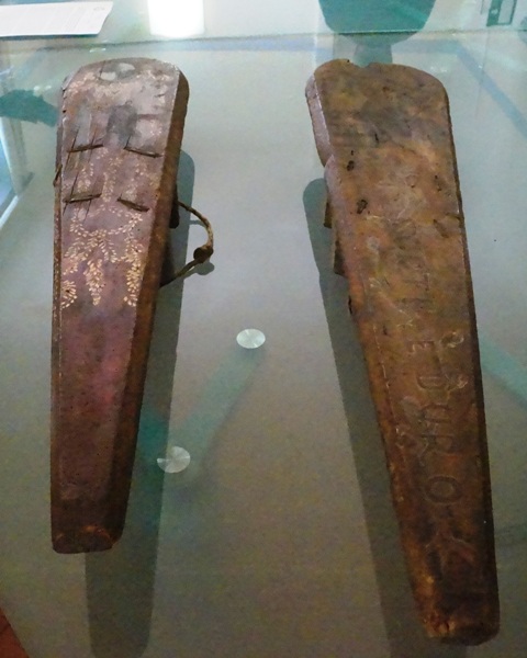 Le caratteristiche tecniche - I due targoni appartengono a questa tipologia di arma da botta, la loro forma, la loro decorazione con i loro colori, li riconoscono spettanti, uno alla squadra del San Marco nel gioco del 1785 e l’altro, datato 1807, alla squadra di Sant’Antonio. Costruiti in legno di pioppo, di misure di circa cm 108 x 23 e peso che, non superi le 5 libbre (fra Kg 2,400 e 2,800) recano entrambi sul retro, i sigilli di omologazione impressi dal Commissario Granducale di Pisa, rappresentati da un cerchio contenente le lettere AVC (Auditore Vicario Cercignani e la data 1785 per quello del San Marco, mentre quello del Sant’Antonio, la data dell’anno 1807 è sottoposta alle lettere VMN (Viviani Marchese Nicolò, il Governatore Militare e Civile della città di Pisa), sormontata da una corona. Il Targone del San Marco presenta un dipinto su campo ocra che richiama l’impresa di un leone alato che impugna una spada, poggiante su un libro aperto. E’ presente un ornato con volute floreali sormontato da un motto: ‘Forte e duro’. Il retro presenta ancora intatte le due maniglie di impugnatura. Il Targone del Sant’Antonio presenta un dipinto a tralci fogliati ocra su campo carminio che ospita un verro galoppante di tinta scura, mentre all’estremità più ampia è inserito uno stemma ovoide inquartato nei colori nero e bianco. Nel retro sono presenti le due maniglie di impugnatura.