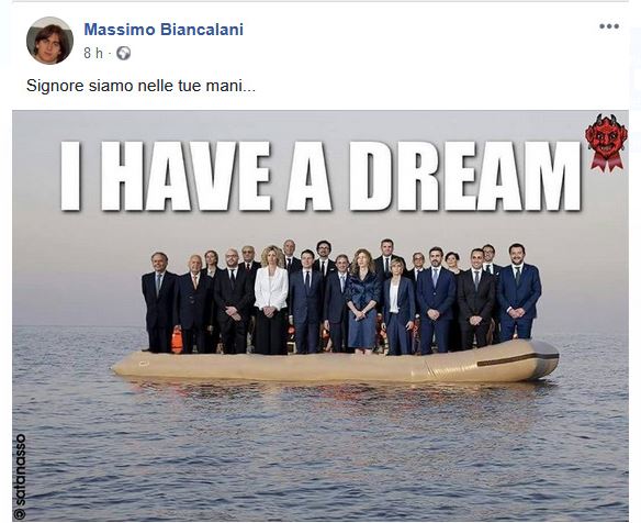 Don Massimo Biancalani, il prete pistoiese, parroco di Vicofaro e Ramini, impegnato dell'accoglienza ai migranti,una sessantina, ospitati nelle due parrocchie e in passato al centro di polemiche, ha pubblicato un post su Facebook in cui ha scritto: "Signore siamo nelle tue mani...", corredato da una foto con un gommone alla deriva su cui appaiono i membri del Governo, che reca la scritta "I have a dream" e un diavoletto a lato.