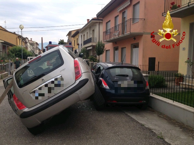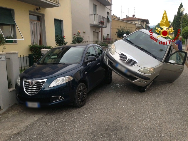 Un incidente curioso è capitato nell'Aretino, a Montevarchi, in via Adige. Questa mattina i vigili del fuoco si sono trovati davanti a questa scena: una Lancia Ypsilon vecchio modello era posata con una ruota su un'altra Ypsilon nuovo modello, parcheggiata a lato della strada. I pompieri sono stati chiamati a mettere in sicurezza l'area. Non ci sono persone ferite. Difficile ricostruire la dinamica che ha portato al 'posizionamento' di un'auto sull'altra, senza che questa si adagiasse su di un fianco.