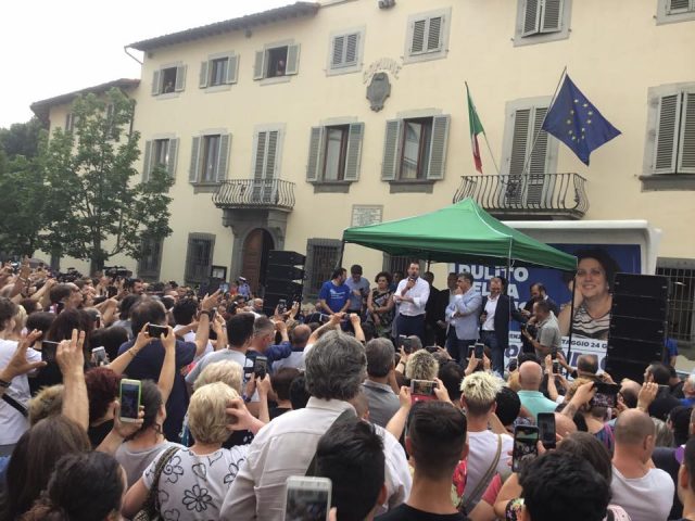 Un'immensa folla ha atteso l'arrivo del Ministro Interni Matteo Salvini a Campi Bisenzio per sostenere la candidatura a sindaco di Maria Serena Quercioli. Nonostante le condizioni meteorologiche avverse, e l'orario primo pomeridiano in un giorno lavorativo, Piazza Dante era gremita.
