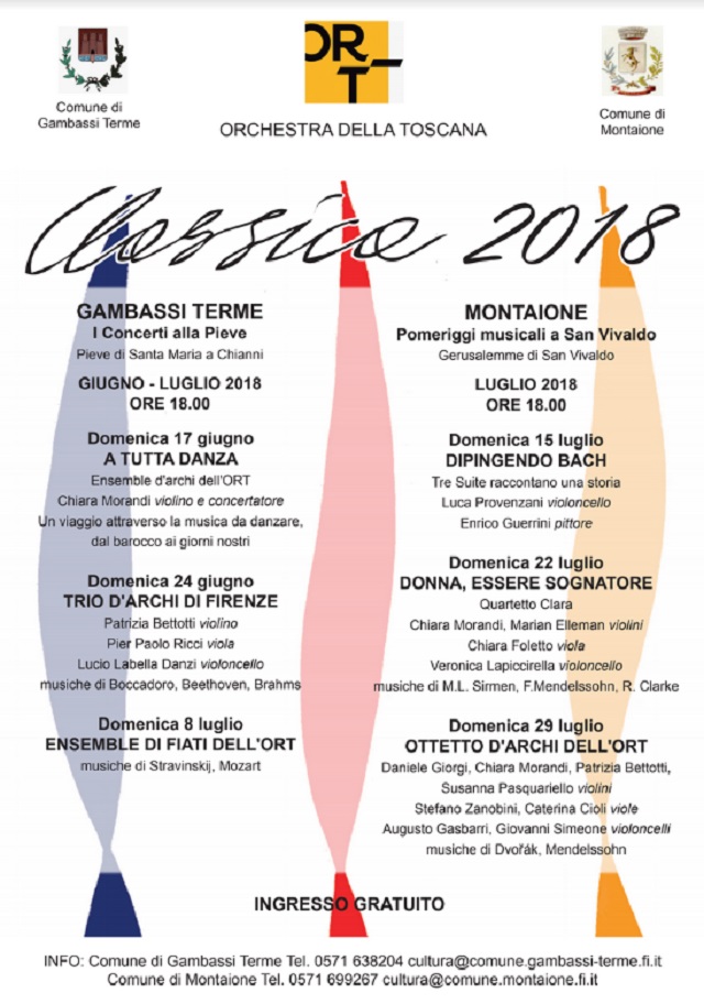 “Classica” la rassegna musicale dei Comuni di Gambassi Terme e Montaione riprende con il secondo appuntamento domenica 24 giugno 2018. La manifestazione nasce nel 1992 con i “Pomeriggi musicali a San Vivaldo”, concerti di musica classica effettuati tutte le domeniche del mese di luglio alle ore 18.00. Dal 1995 l’iniziativa ha preso il nome di Classica e si svolge in collaborazione fra i Comune di Gambassi Terme e di Montaione. Come di consueto anche quest’anno l’organizzazione dei concerti è affidata alla Fondazione Orchestra della Toscana, che ha formulato per i due Comuni un'articolata proposta musicale impegnando i solisti e i vari ensemble dell’ORT. In programma insolite pagine musicali insieme alle più celebri della letteratura per musica da camera con l’alternanza di alcuni gruppi da camera dell’ORT in formazioni che vanno dal trio al quintetto, fino ai tradizionali ensemble. I Concerti, con appuntamento domenicale da giugno a luglio, hanno luogo presso la Pieve di Santa Maria a Chianni di Gambassi Terme (ore 18.00) e alla “Gerusalemme di San Vivaldo” a Montaione (ore 18.00), e sono ad ingresso gratuito.