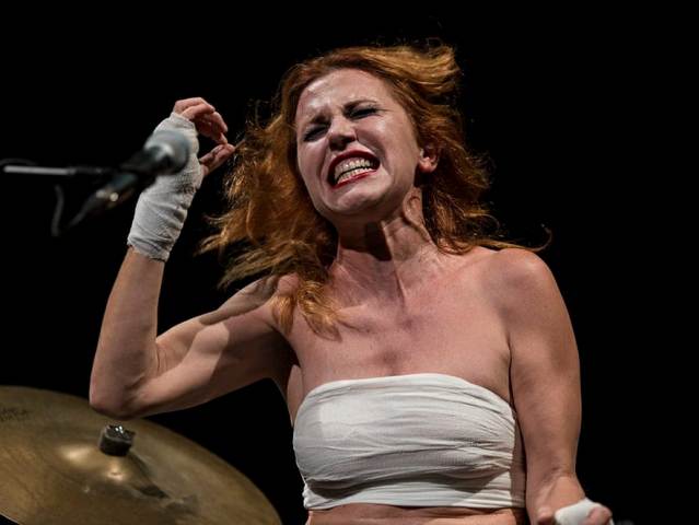 Sola in scena, il concerto per voce e batteria si intreccia con le meravigliose musiche originali del Maestro Arturo Annecchino. I tamburi ed i piatti, suonati dal vivo, sono come una drammaturgia dell’anima, espressione di una emozionalità estrema che cerca così di gridare tutta la sua sofferenza.