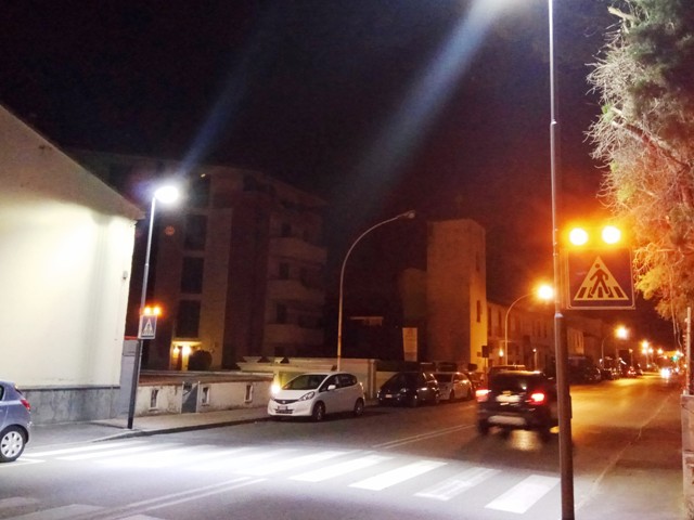 L’attraversamento vede normali ‘strisce pedonali’, la particolarità sta nell’impianto di illuminazione a led che nelle ore serali e notturne rende molto più visibile ai conducenti la persona che si trova sulla carreggiata.