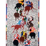 Giannelli, avendo spazio da mettere a disposizione della sua infinita creatività, è riuscito a materializzare sulla stoffa le sensazioni, anche attingendo alla tavolozza dei colori per i dieci cavalli che danno vita alla Carriera. Sempre a colori i fantini. Tutti di spalle, così da rappresentare sui loro giubbetti l’araldica contradaiola. Una scelta stilistica diversa e di grande effetto visivo. Una corsa sfrenata su quell’anello di tufo che viene per lo più immaginato, giocando sulla proposizione di una sezione del costruito che delimita la Piazza, e dove primeggia il Palazzo Pubblico e la Torre del Mangia.